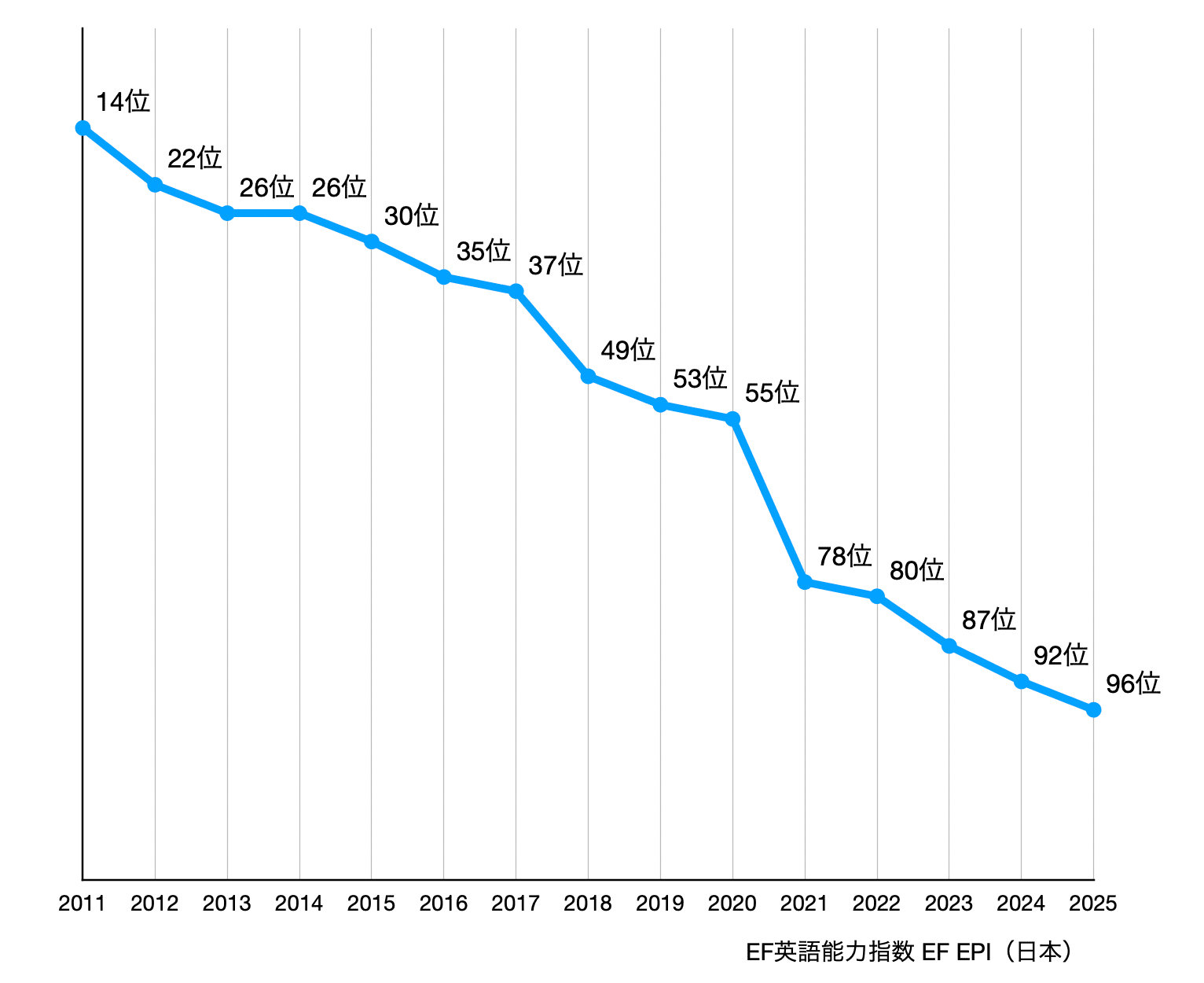 EF(国際語学教育機関)が発表した2025年の調査によると、英語を母語としない123カ国・地域のうち、日本人の英語力は96位に順位を落としました。